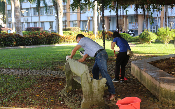 为营造良好的校园晨读氛围,引领学生勤奋好学,将学习作为一种乐趣,按照学院的统一部署,西语系每天安排2个班级分别到学院北门两棵榕树下或草坪上晨读。为给学生创造干净优美的读书环境,西语系两个基层党支部的全体党员于今天下午开始清洁两棵榕树下及周边的卫生,大家不怕脏、不怕累,扫的扫、捡的捡、擦的擦,干得认真而仔细。做为总支书记的李南群书记,先是做好分工安排,指导党员们怎么做,同时亲自去学院垃圾桶放置处推来一个大垃圾桶,并选择了最脏的活干了起来——用抹布一点一点清洁榕树下的石椅和榕树围栏的瓷砖。因长时间没人清洁,石椅和围栏瓷砖上沾满了污垢和腐烂的榕树上落下的果实、鸟粪等,这些东西不是用抹布轻轻抹一下就可以搞定的,而是需要用抹布用力搓才能搓得掉,洗抹布的水全是脏得发黑,换了好几次水。最后,我们清理出了满满一大桶垃圾,石椅和围栏瓷砖也擦得干干净净,大家都觉得非常有成就感。