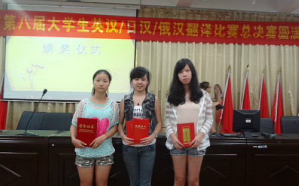 我系3名同学在此次俄汉翻译大赛总决赛中喜获佳绩,其中汪娟同学(左一)获得一等奖,王申同学(左二)获得三等奖,颜梓萱同学(右一)获得优胜奖