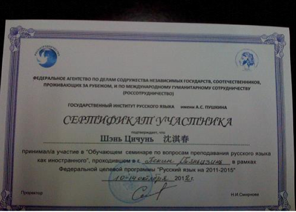 研讨会结束后,天津外国语大学副校长王铭玉出席闭幕式并与北京俄罗斯文化中心领导共同为我系俄语教师颁发了合格证书。