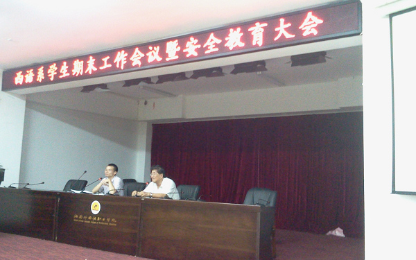 2012617日晚730分,西语系在图书馆多功能报告厅召开20112012学年度第二学期期末学生工作会议暨学生安全教育大会。西语系负责人陈国亭教授、党支部张政书记、团总支顾大育书记、学生科莫少金科长及全体辅导员、班主任以及全系在校学生参加了会议。
