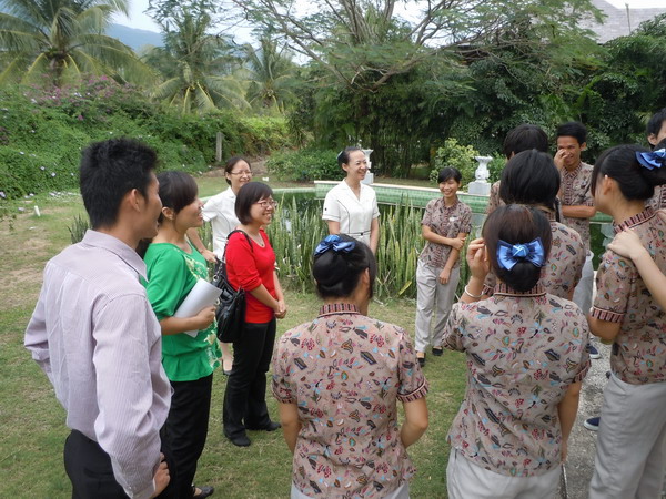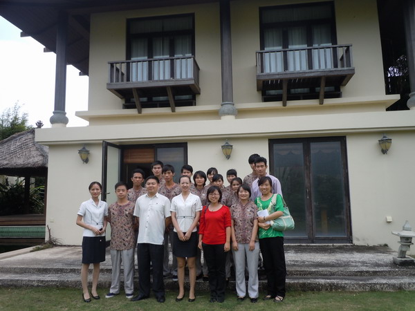 看望在亚龙湾五号度假别墅酒店集中顶岗实习的09级学生,刘主任人资部经理、人资培训经理吴素环和学生们进行了愉快的交流。