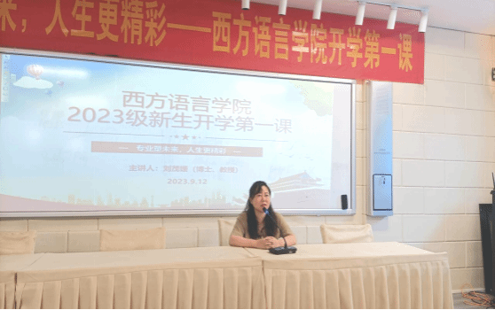 2023年9月12日上午,西方语言学院副院长刘茂媛教授在综合楼BE101教室为西方语言学院2023级全体新生做题为“专业塑未来,人生更精彩”的“开学第一课”,从学院情况、师资力量、专业建设、比赛获奖、社会服务、创新人才培养模式、升学就业等方面让新生对我院有了全面的了解,对新学业新学期有了向往与期待。
