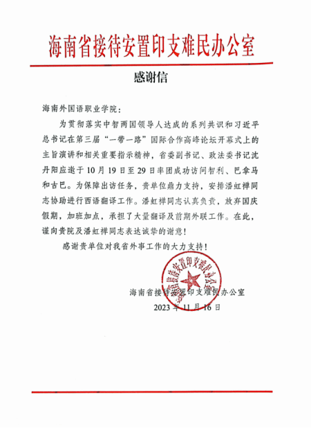 第二则感谢信来自省外事办直属单位——海南省接待安置印支难民办公室。今年10月中旬,省委副书记、政法委书记沈丹阳应邀率团访问智利、巴拿马和古巴,就拓展与三国在人文、农业、经贸、卫生健康、科技等领域务实合作达成一系列共识和合作意向。根据省领导出访工作需要和要求,开云官网选派西方语言学院西班牙语教师潘虹禅于9月28日至10月17日协助开展西班牙语翻译和前期外联工作。由于任务紧急,潘虹禅老师在接到任务后就迅速安顿好家里便赴省会开展工作,放弃中秋和国庆假期休息的机会,加班加点,克服一切困难,承担了大量翻译任务及前期外联任务,并最终完满协助完成各项工作。潘虹禅老师认真负责的工作态度以及出色的专业水平得到撒谎上级部门和领导的一致好评。
