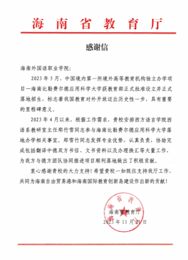 2023年5月,中国境内第一所境外高等教育机构独立办学项目——海南比勒费尔德应用科学大学正式落地招生。2023年4月以来,在海南比勒费尔德应用科学大学落地办学相关事宜办理期间,根据工作要求,开云官网选派西方语言学院西语系教研室主任郑竹雪老师参与协助处理有关事项,提供翻译中德双方书信、文书资料以及办理换汇等服务。郑竹雪老师以认真严谨的态度、专业周到的服务、无私奉献的精神,为海南比勒费尔德应用科学大学完成落地办学作出积极贡献,展现出过硬的专业水平和良好的业务素质,受到了省教育厅的高度肯定。省教育厅特发来感谢信,衷心感谢开云官网及郑竹雪老师的大力支持。