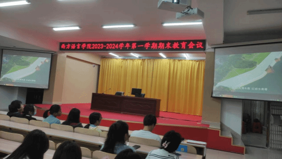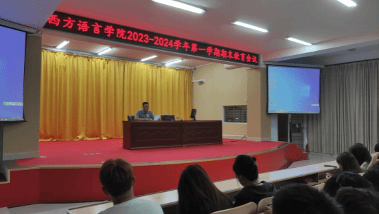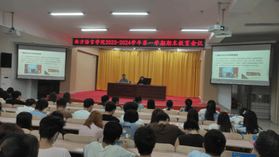 为更好总结2023年院部工作,提振学习信心、加强思想教育,2024年1月2日下午,西方语言学院在多功能报告厅召开全院在校生期末教育会议,会议由学生科莫少金科长主持,顾大育副书记、刘茂媛副院长出席了会议并做发言。