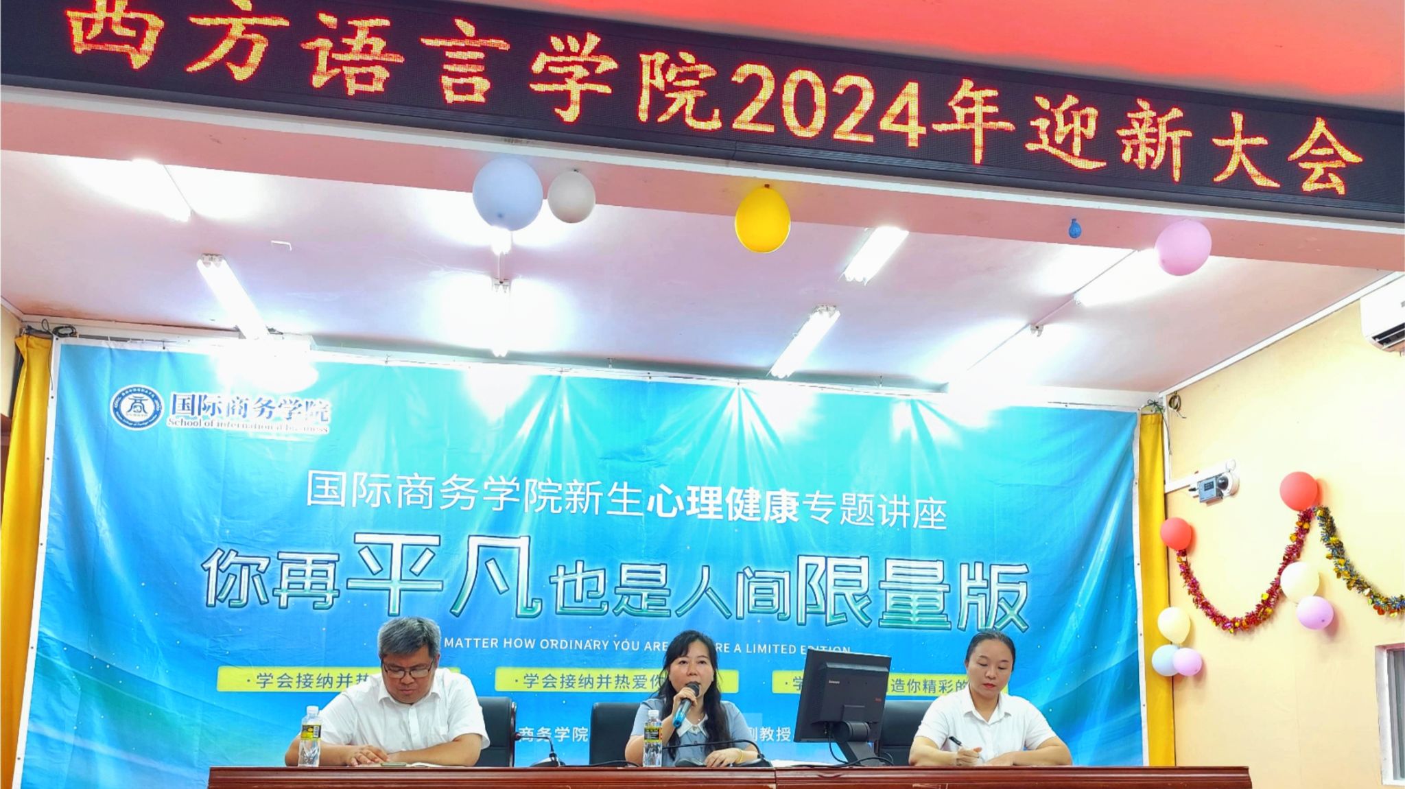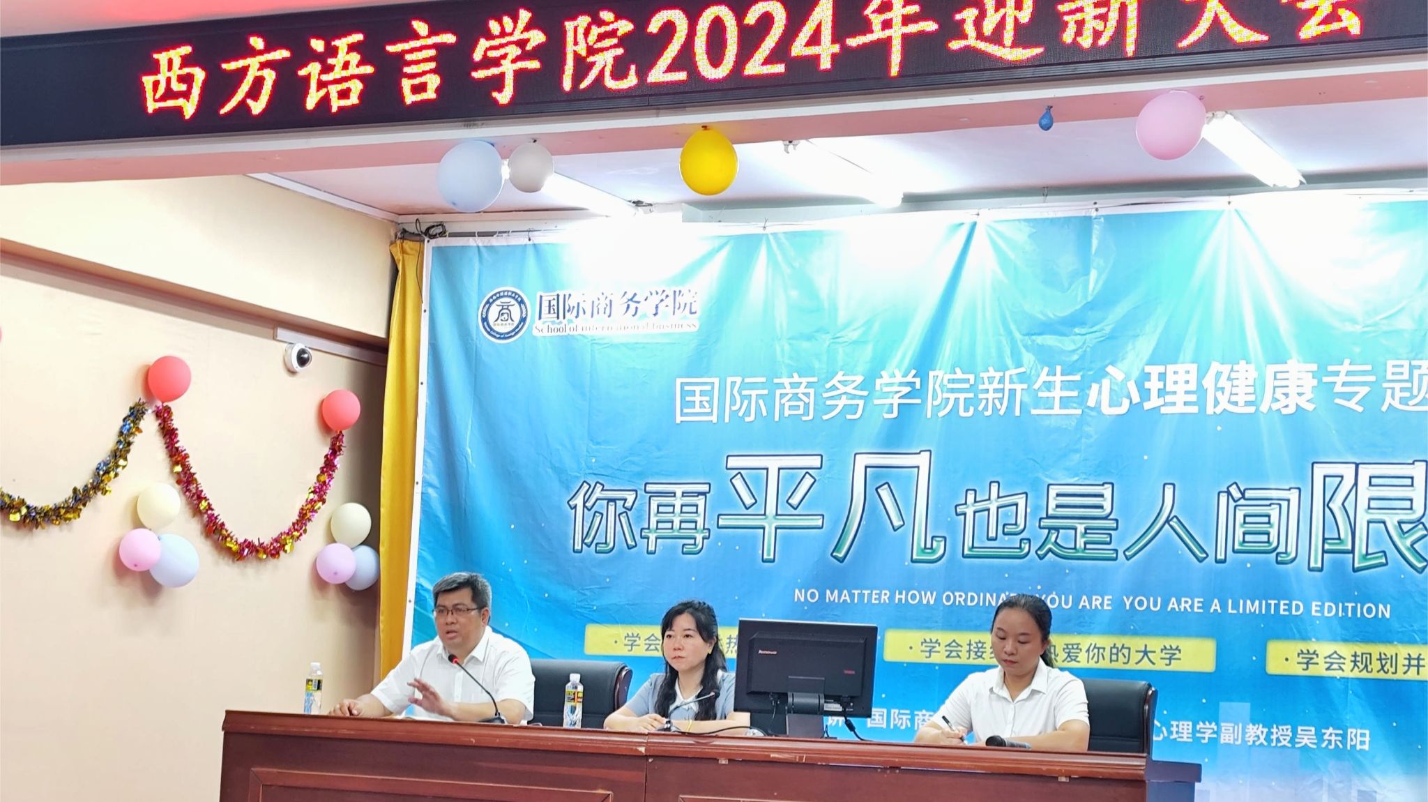 2024年9月29日,西方语言学院2024级迎新大会在多功能报告厅隆重举行。院长刘茂媛教授、党委副书记符振忠、团总支负责人史丹娆、办公室主任桂雯雯、学生科负责人李聪慧,新生班主任、辅导员及全体2024级新生出席大会。