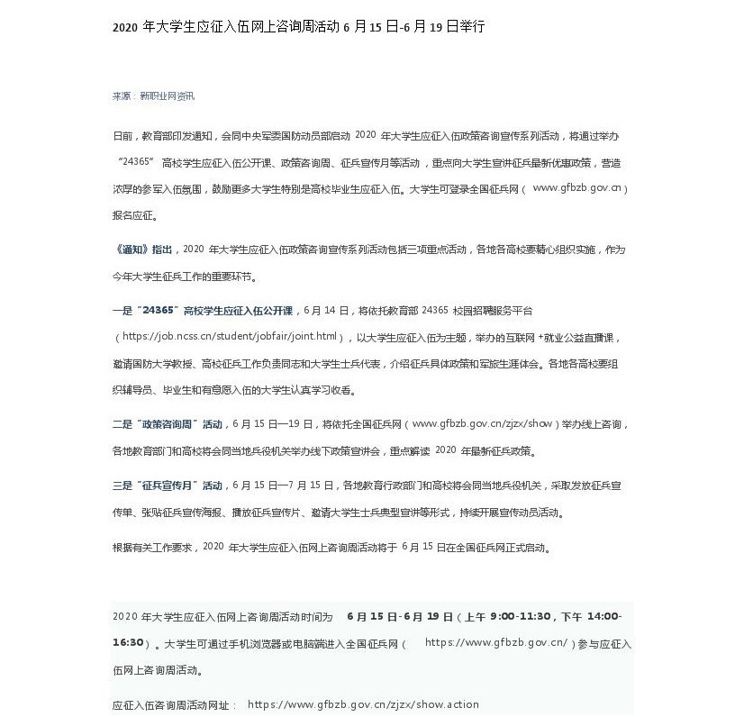 【政策资讯】2020年大学生应征入伍网上咨询周活动6月15日-6月19日举行