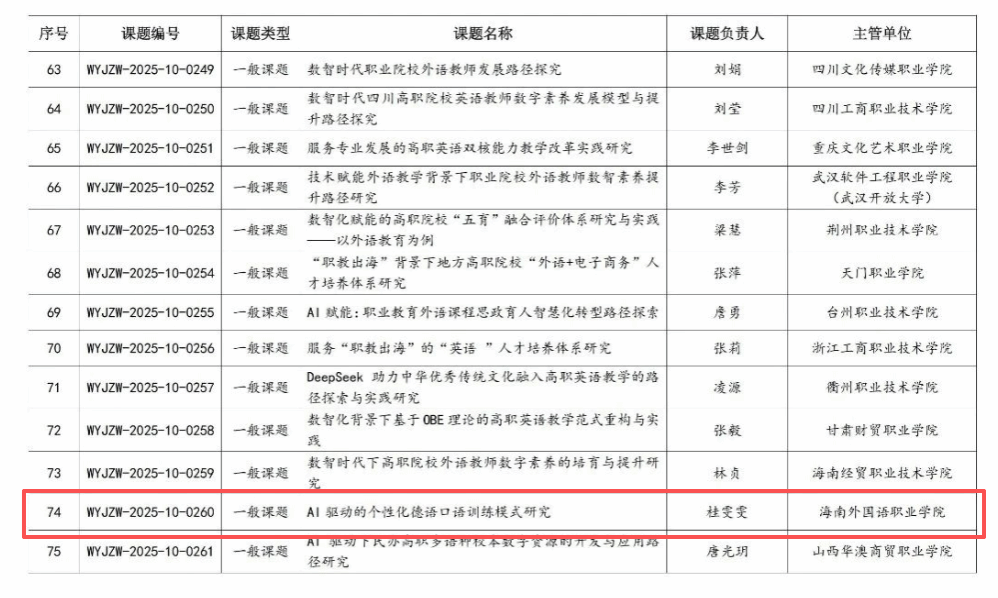 本次专项课题是外语教指委为深入贯彻党的二十大精神、全面落实《教育强国建设规划纲要(2024—2035年)》要求而启动的重点科研项目,核心目标是通过数字化与人工智能技术破解职业外语教育痛点,推动 “三教” 改革落地,助力职业院校培养适配产业升级与 “一带一路” 建设需求的国际化外语人才。课题申报自 2025 年 5 月启动后,全国各职业院校外语专业教师积极参与,经资格审查、专家匿名评审、立项公示等多轮严格筛选,最终确定立项名单,评审全程遵循“科学、公平、公正、公开”原则,确保立项课题的学术价值与实践意义。