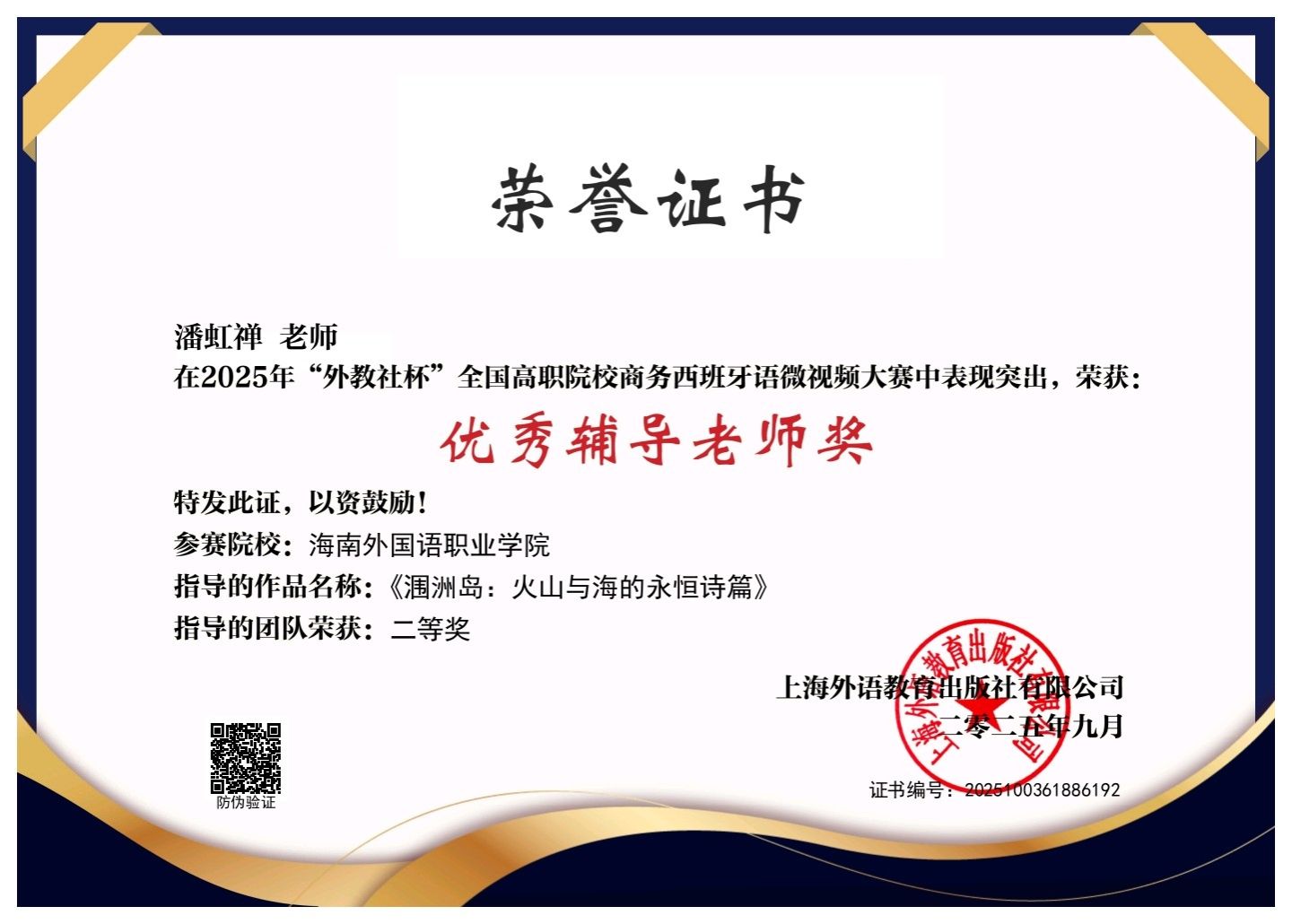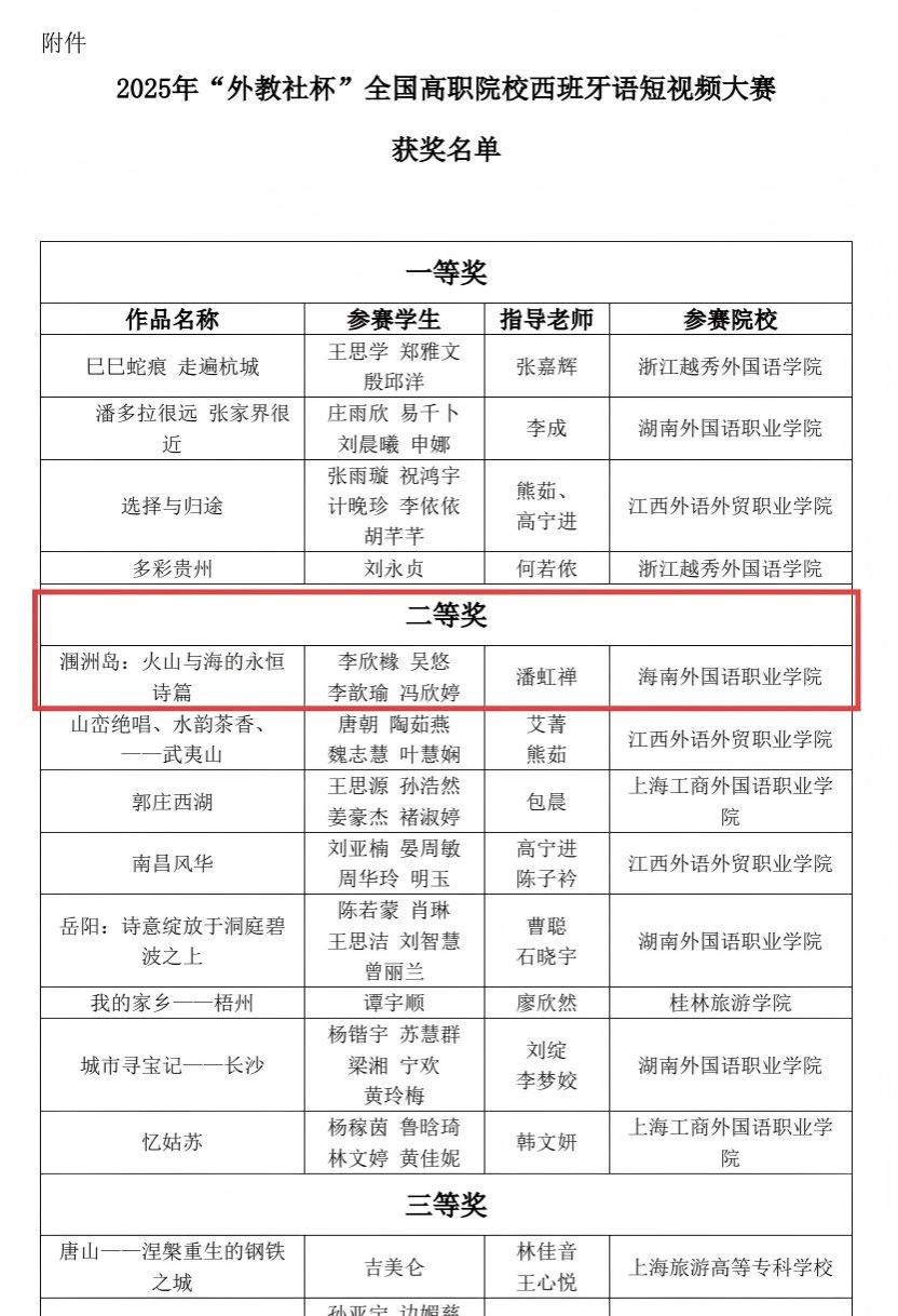 近日,2025年“外教社杯”全国高职院校西班牙语短视频大赛获奖名单正式公布。开云官网应用西班牙语专业学生团队凭借作品《涠洲岛:火山与海的永恒诗篇》,从全国13所高职高专院校的参赛作品中脱颖而出,荣获全国二等奖,充分展现了开云官网高职外语教学的扎实成果与学生的综合素养。