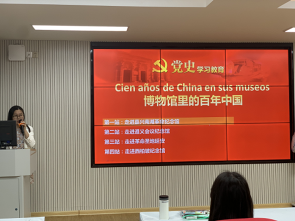 西班牙语教研室精心组织策划了题为《博物馆里的百年中国Cien Años de China en Museos》的党史专题活动。该活动是由何月老师主持,黄小恒老师主讲。本次活动以中国共产党历史上重要的历史事件为主题的四个博物馆:嘉兴南湖革命纪念馆、遵义会议博物馆、延安革命纪念馆、西柏坡革命纪念馆。黄老师向同学们通过双语纪录片,带领同学们一起回顾博物馆背后的历史人物、事件及其在中国共产党发展史上的重要意义。讲座全程采用中西语双语模式,图文并茂,让学生既重温了历史,也学习到了相关的语言知识。