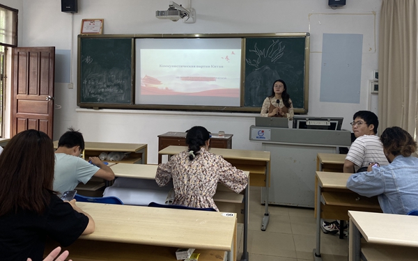 其中应用俄语专业赵晨希老师为20、21级的学生讲述了俄语版的中国共产党发展史。从建党初期所遇到的艰难险阻,到党领导人对中国共产党发展至今做的伟大贡献,都一一罗列,旨在教育学生珍惜现在和平、富裕的生活,努力学习,共同为实现中华民族伟大复兴而奋斗,同时也可以学习专业知识,学会用俄语传播中国文化与精神。