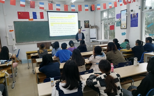 11月23日上午在1302教室,西语系应法专业20和21级全体学生齐聚一堂,聆听由林师茂老师主讲的“新时代背景下如何用法语讲好中国故事”讲座。本次讲座分别从以下几个方面展开:一、新时代背景下为什么要讲好中国故事;二、讲好中国故事需要讲哪些内容;三、如何用法语讲好中国故事。