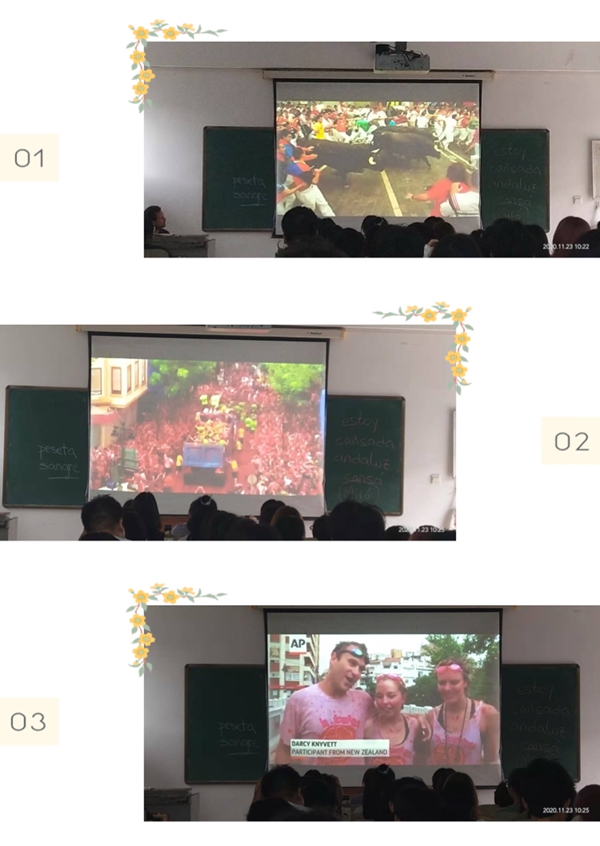 在活动接近尾声时,外教通过视频的形式给学生介绍了西班牙的传统活动,如法雅节(Las Fallas)、奔牛节(Los San Fermines)、西红柿节(La Tomatina)。这些传统活动让学生对西班牙产生了向往。