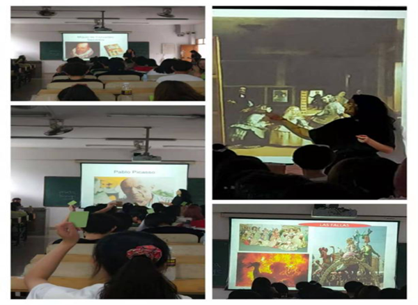 接着外教通过图片和视频的方式讲述了西班牙的文学和绘画,以塞万提斯、毕加索、米洛为例,让学生对西班牙的文学和绘画有了初步的了解。
