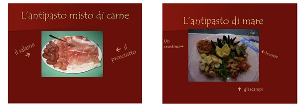 外教为同学们介绍意大利“头盘”开胃菜,常见的有混合肉开胃菜和海鲜开胃菜