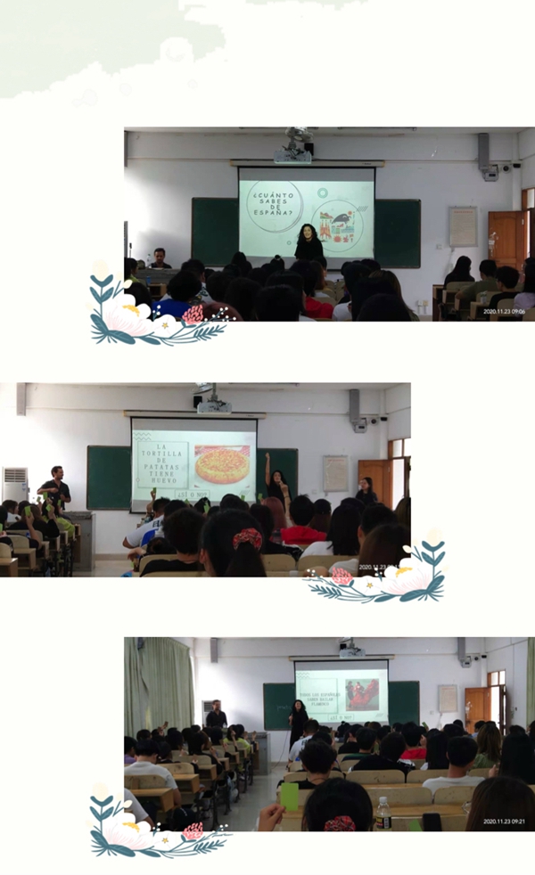 正值2020年冬季小学期的第一天,西班牙语外教露西亚、阿尔贝托在多媒体15教室给西语系应用西班牙语专业全体师生开展了一场生动有趣的文化讲座,简要介绍了西班牙的地理位置、生活方式、语言和传统文化节日等方面。