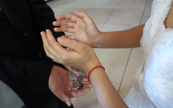 除了婚戒,西班牙婚礼还有一个仪式:男方要送给女方12枚硬币作为彩礼,它象征着新郎的财产为两人共同拥有,而且他们会在将来一起守护它。