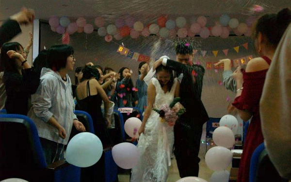 仪式首先是新郎挽着妈妈进场,然后新娘挽着爸爸进场。之后是主持人、新郎父母、新娘父母、伴娘伴郎代表等等轮流讲话。