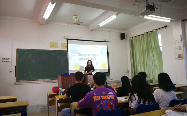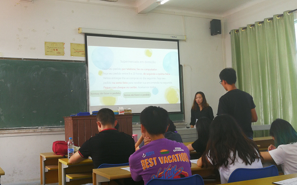 葡语冯浪老师课件背景小清新,吸引学生的学习兴趣,课堂气氛轻松,课前通过提问的方式,引入本节课的主题“网上超市”,内容新奇有趣,学生们积极参与。