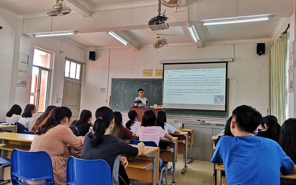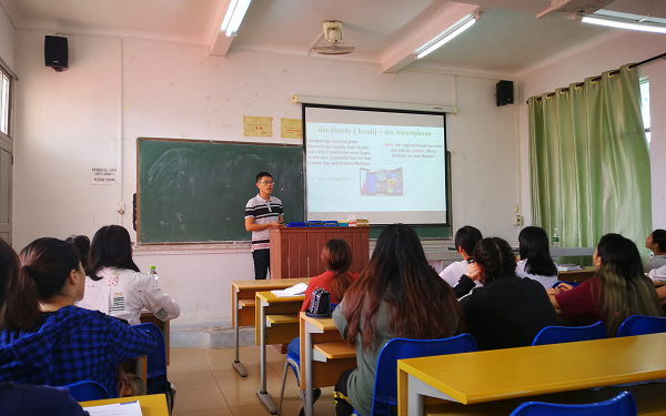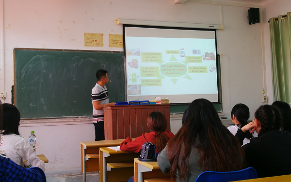 德语老师肖明杰的授课内容为课文“手机对于年轻人的意义”的第2部分“手机在日常生活中扮演的角色”。首先,肖老师通过图片介绍现如今年轻人如何使用手机的相关背景信息,学生们与老师一起发散思维,列举手机的用途。