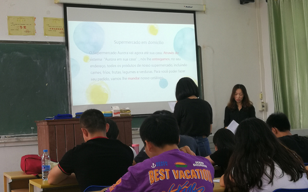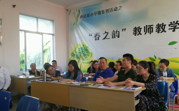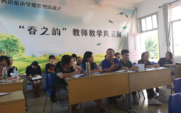 西语系曲教授给老师们讲解了此类课程的讲授方法,希望老师们在课堂上能要求学生用外文进行复述或转述,单词应在课文中讲解,而不是单独罗列,另外在外语课堂上应用外文授课,中文辅助授课。