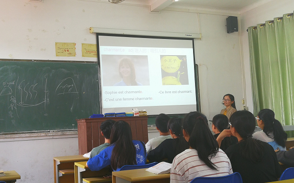 法语老师黄牡丹教态自然,课堂气氛轻松,讲解详细,与学生互动频繁,ppt展示一张女孩照片并提问,要求学生带着问题进入课堂学习。