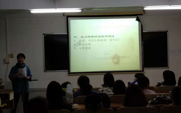 是的,总的来说就是一般能力,专业能力和发展能力。同学们,你们拥有了哪些能力?又欠缺了哪些能力呢?听了教授的讲座,我们是不是该有所感悟并为之努力呢!可是,我们又该如何培养这些能力?请听教授往下说: