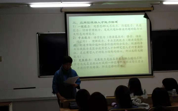 讲座开始时,冯教授给师生们讲解了应用型德语学习的前提,涉及到我国应用型高等教育转型的话题,虽然一开始,同学们并不是太理解,但在教授具有魅力的言语中,同学们慢慢被吸引。