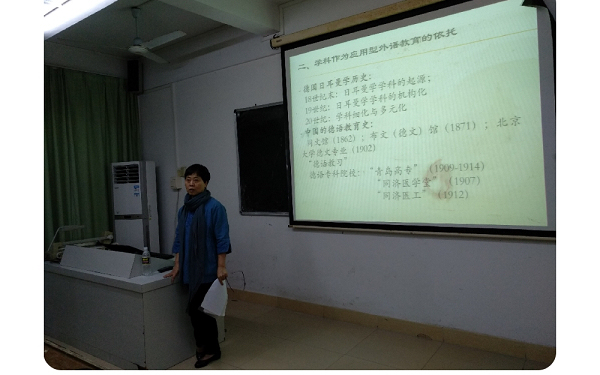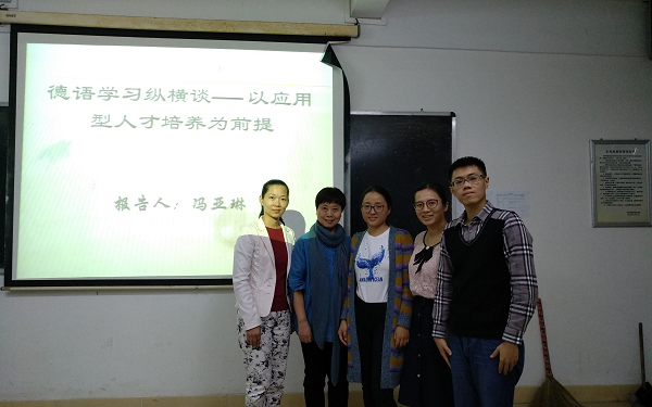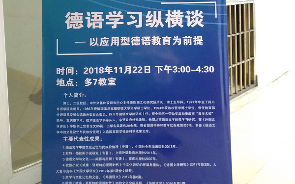 2018年1122日下午,我们有幸邀请到中外文化比较研究中心主任兼欧洲文化研究所所长,重庆市学术、技术德语学科带头人,冯亚琳教授为德语专业师生做了一场别开生面的,题为“德语学习纵横谈 — 以应用型德语教育为前提”的讲座。分为3个环节:一是讲座环节;二是学生与教授的互动环节;三是教授与德语教师的座谈。