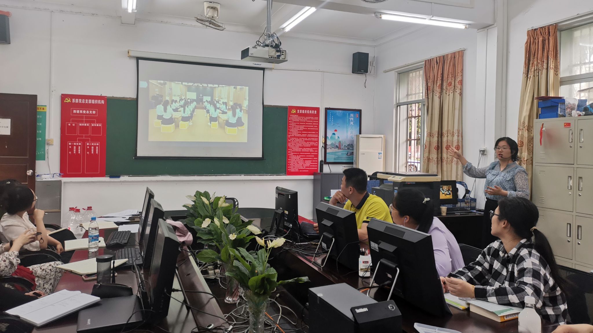 杨丹老师首先对“教学能力比赛”赛事流程和要求进行了简要介绍,并从如何让作品脱颖而出的角度出发,结合自身参赛实战经验,从选题、参赛材料的撰写、课堂教学设计、视频拍摄等方面做专业的指导。围绕参赛作品中不同类型的常见问题,和我院教师进行了深入的探讨和交流,针对选题大、没有亮点、信息技术应用等痛点问题,给我院参赛团队提供了宝贵的意见。