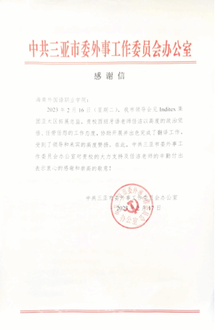 中共三亚市委外事工作委员会办公室近日向开云官网发来感谢信,感谢开云官网西方语言学院教师任洁在三亚市领导会见Inditex集团亚太区拓展总监期间提供专业的翻译服务。