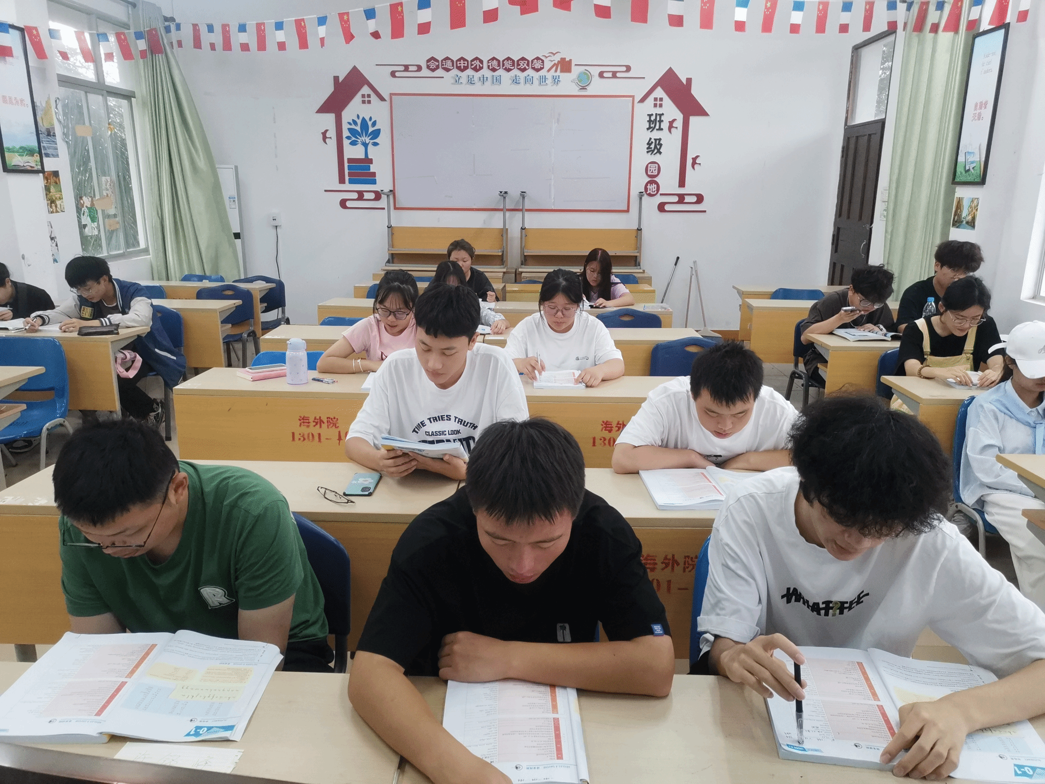 各班同学在带读学生领读下大声朗读外语。俄语的神秘,德语的韵味,法语的浪漫,西班牙语的热情,意大利语的优雅,葡萄牙语的活力,这些声音交织在一起,就像一首美妙的交响曲,萦绕在清晨校园里,让人心潮澎湃。每一个音节和旋律都透露出学生们对知识的渴望和对未来的期待。