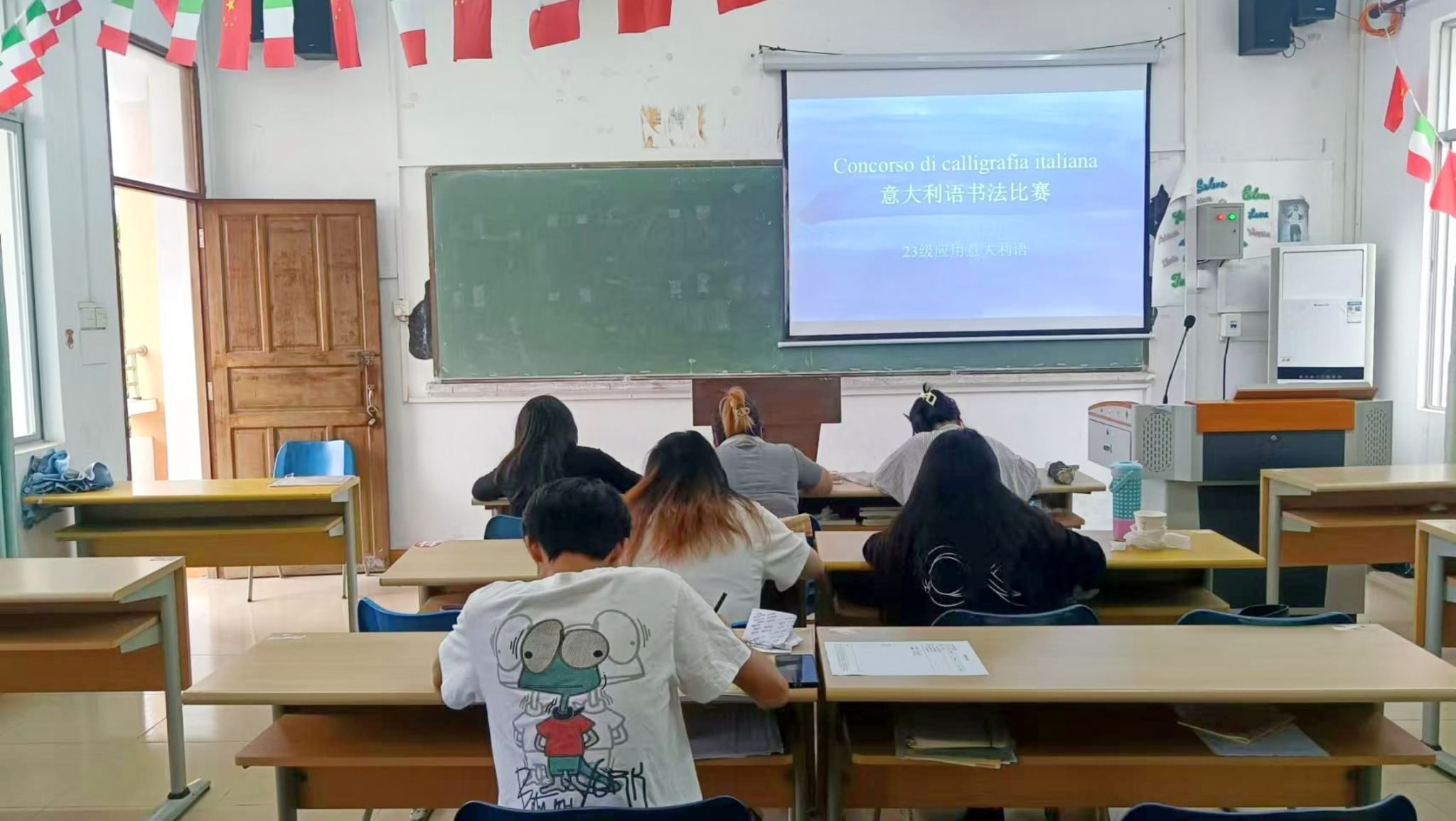 图为意大利语许金然老师带领2023级意大利语学生进行党的二十大报告意大利语版纲要内容书法比赛现场