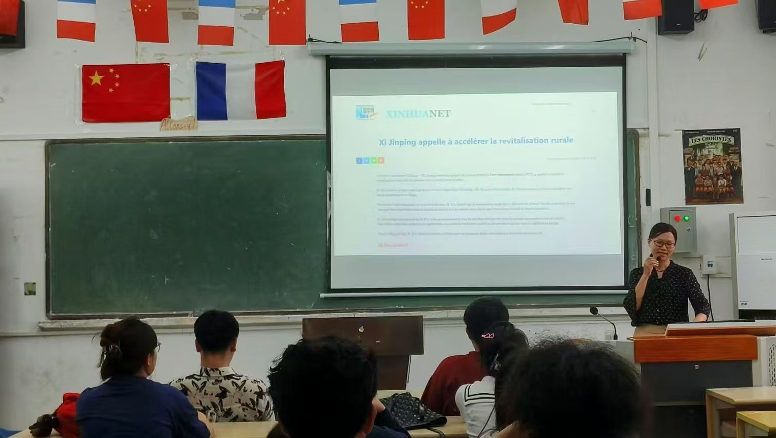 图为法语专业周昱老师向2023级应用法语班、2023级(501)应用法语班学生讲解“乡村振兴、科技强国”等治国理政思想法文版