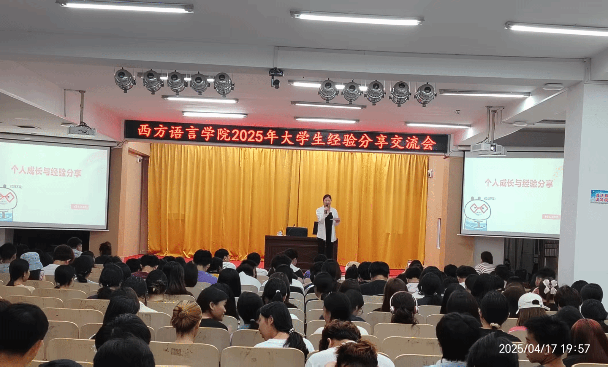 活动正式开始后,六位来自不同专业的学生代表依次上台分享。他们以自身奋斗历程为蓝本,带来精彩经验盛宴。学习上,有人分享语言学习妙招,如借追剧、交流软件提升听说能力,强调专注学习与合理规划;有人传授英语四级备考策略,涵盖词汇、听力到写作各板块。实践中,参赛同学讲述应对竞赛压力、提升能力之法;支教同学分享志愿感悟,鼓励大家投身公益。还有同学结合团学工作,介绍与同学相处、反馈需求的经验,并讲解入团入党流程,激励同学积极向党团靠拢。