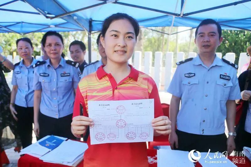 2018年5月14日上午,“百万人才进海南-海口在行动”宣传服务活动在30年前“十万人才下海南”的集散地——海口东湖三角池举行,来自吉林省的美术教师郑淼成功落户海口市龙华区,成为政策实施后首位落户的人。来源:人民网海南频道