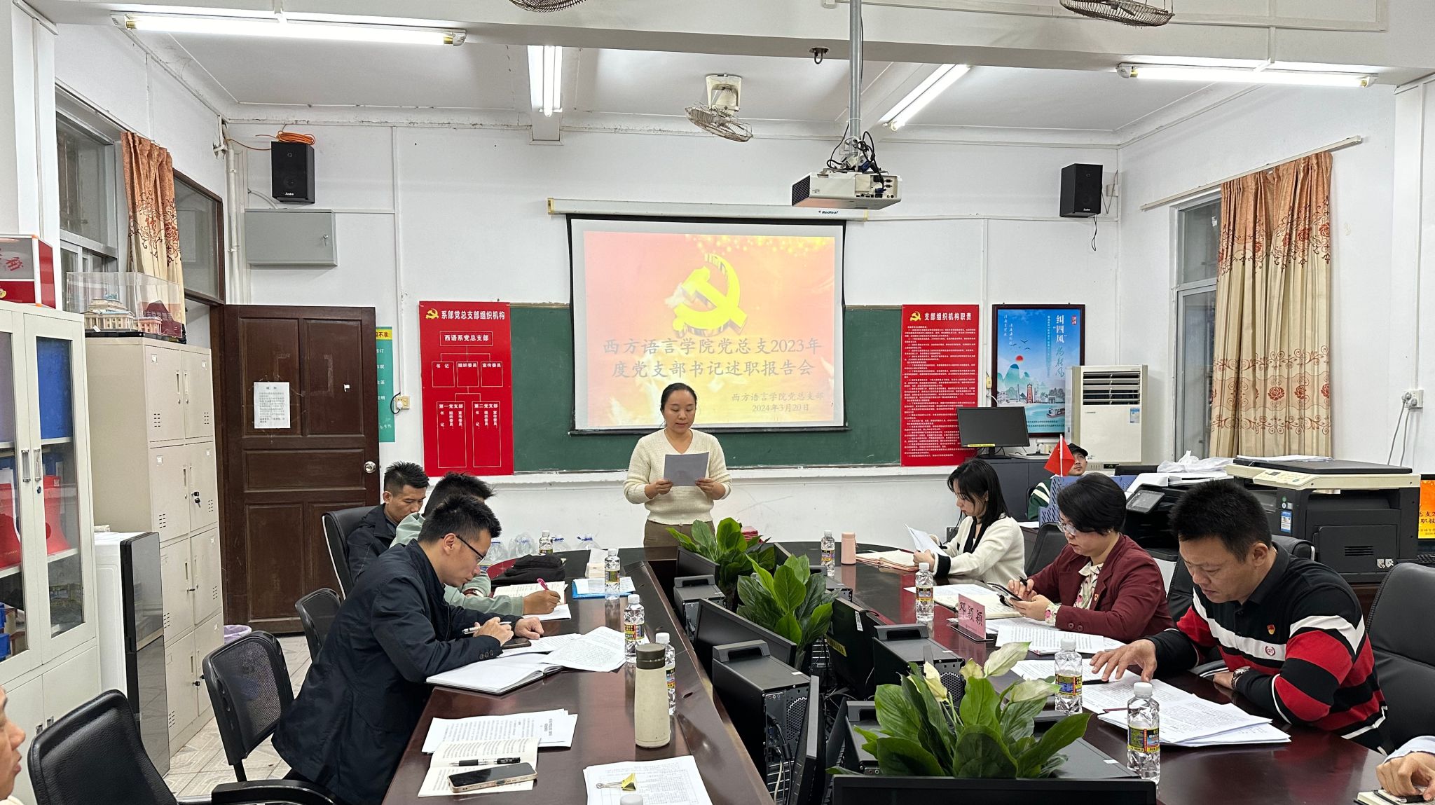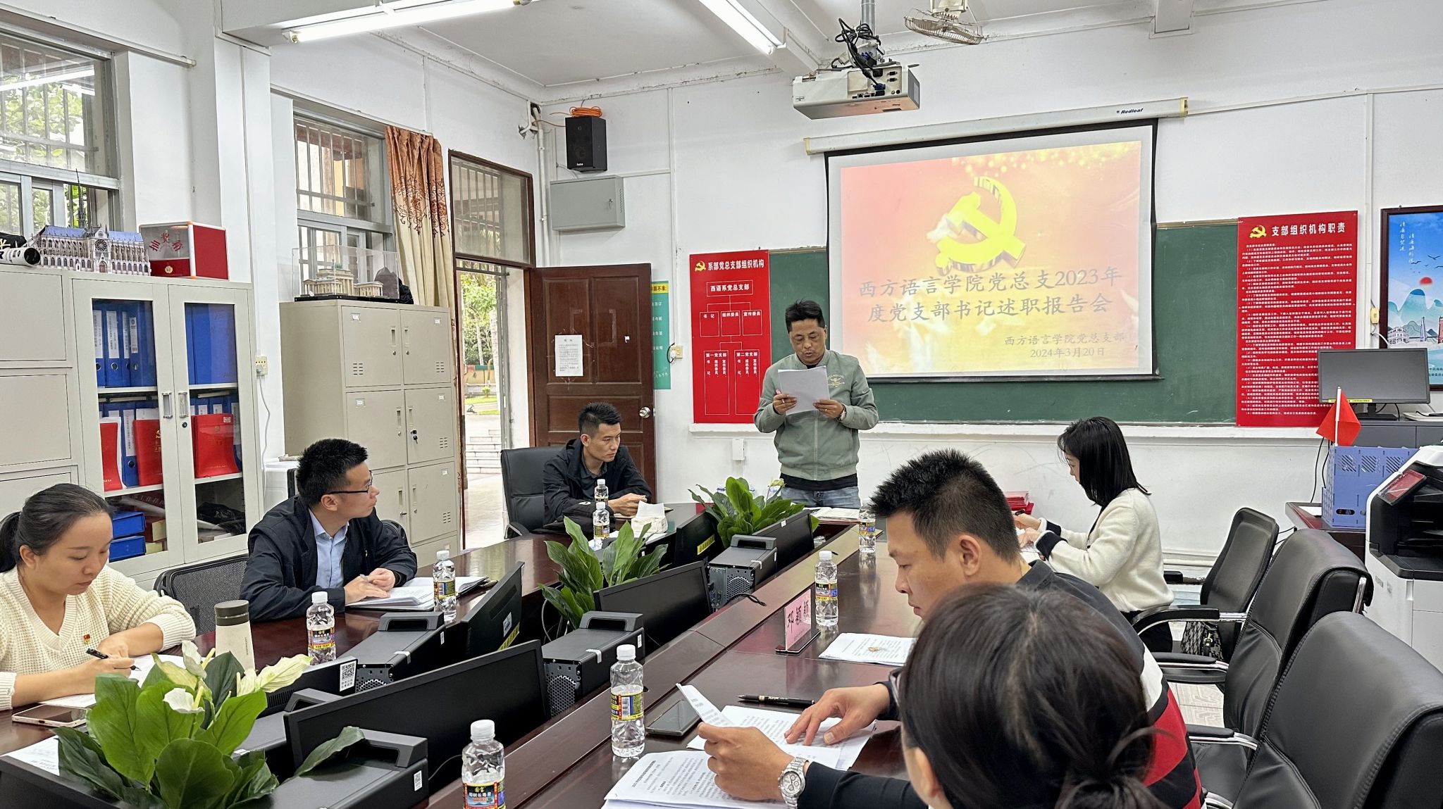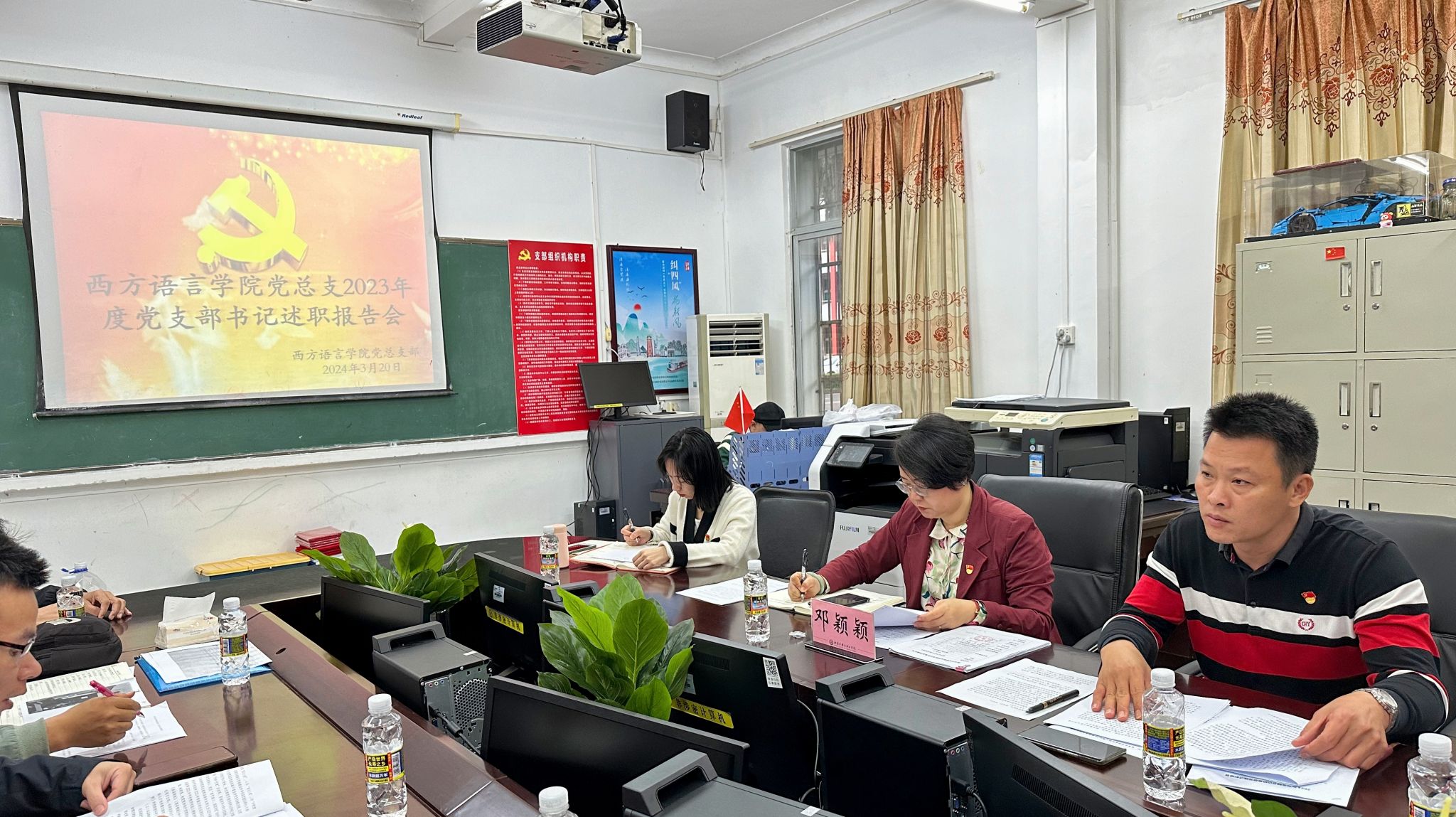 为切实压紧压实管党治党政治责任,推动学院党建工作提质增效,2024年3月20日下午,西方语言学院党总支部在党员活动室召开2023年度党支部书记述职评议会。学校党委委员、副校长邓颖颖同志出席会议,学院党总支部委员、各党支部委员、师生党员和群众代表参加会议。会议由党总支副书记顾大育主持。