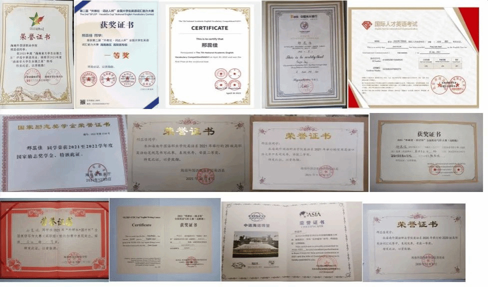 在校期间她曾获2021-2022年国家本(专)科生励志奖学金;2021年“外研社·国才杯”全国英语写作大赛(高职组)英语专业组二等奖;第七届全国学术英语词汇竞赛高职高专组全国一等奖;2021年度海南省“大学生自强之星”荣誉称号;2021“外研社·国才杯”全国英语写作大赛(高职组)复赛(海南赛区)英语专业组特等奖;第二届“外教社·词达人杯”全国大学生英语词汇能力大赛海南赛区高职高专组一等奖;2022年开云kaiyun登录入口“五四优秀共青团员”称号;获得国家级奖项3项,省级奖项6项,院部及系部奖项30余项。