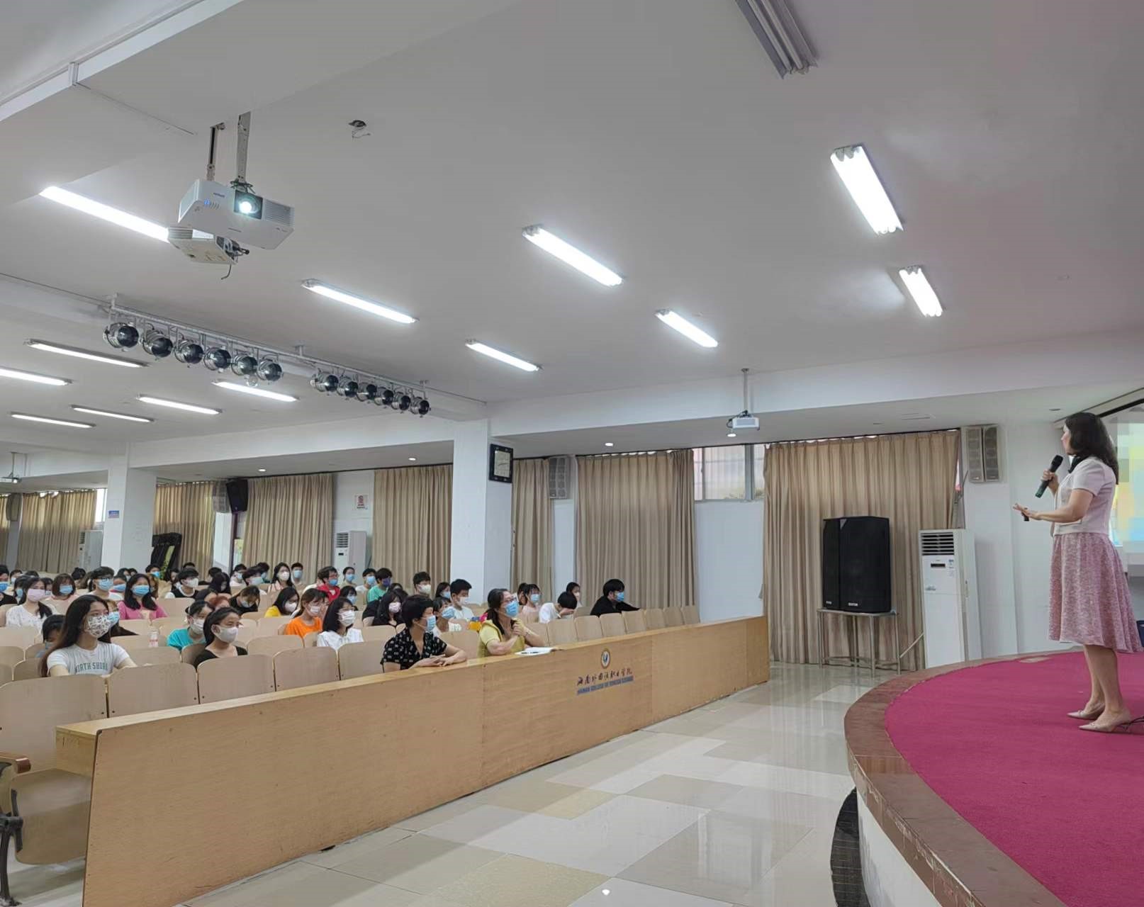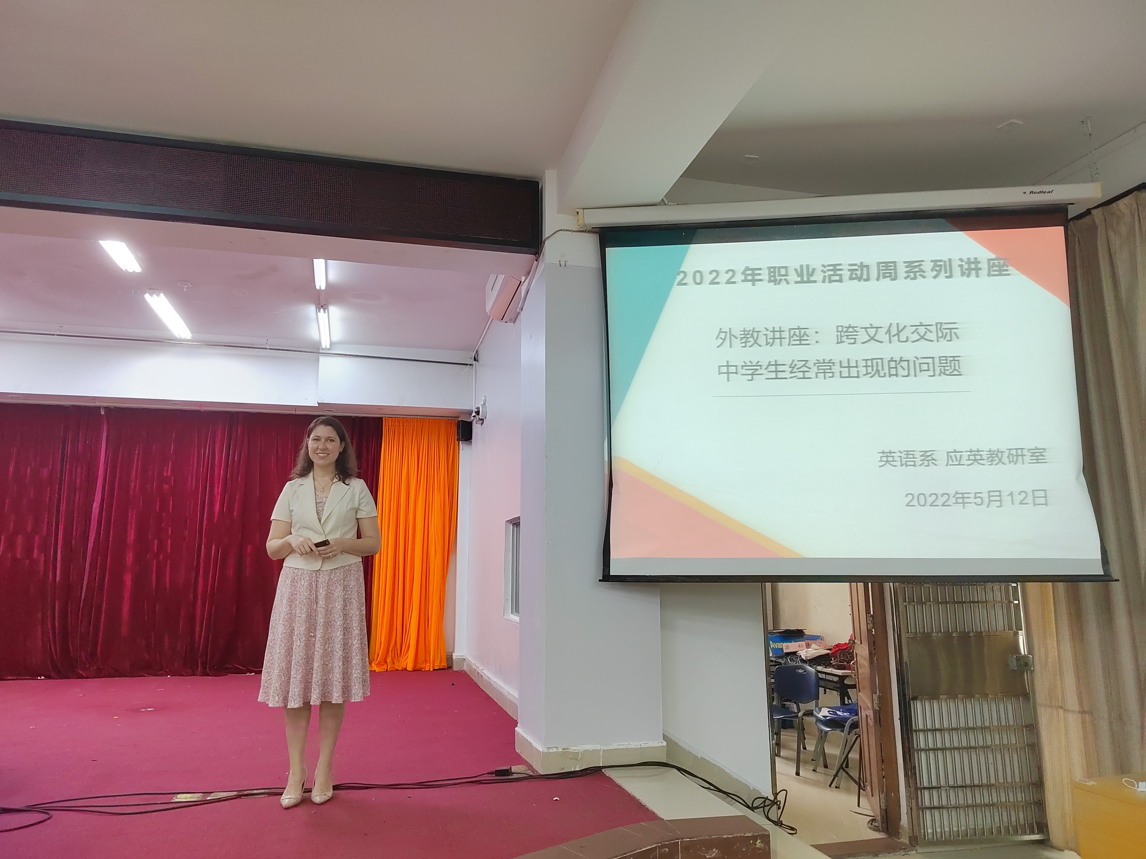 为了提高我系学生的英语学习兴趣,扩大学生的英语知识面,增进外籍教师和学生的交流,培养学生跨文化交际意识,2022年5月12日早上8点,英语系应用英语教研室在多功能报告厅举行了以“跨文化交际中学生经常出现的问题”为主题的讲座。我院外籍教师Sarah 为此次讲座主讲人,吴燕慧老师为主持人,我系副主任李朝霞副教授带领李杏妹老师、苏庆月老师等诸位教师以及21应用英语专业1-3班的学生聆听了此次讲座。