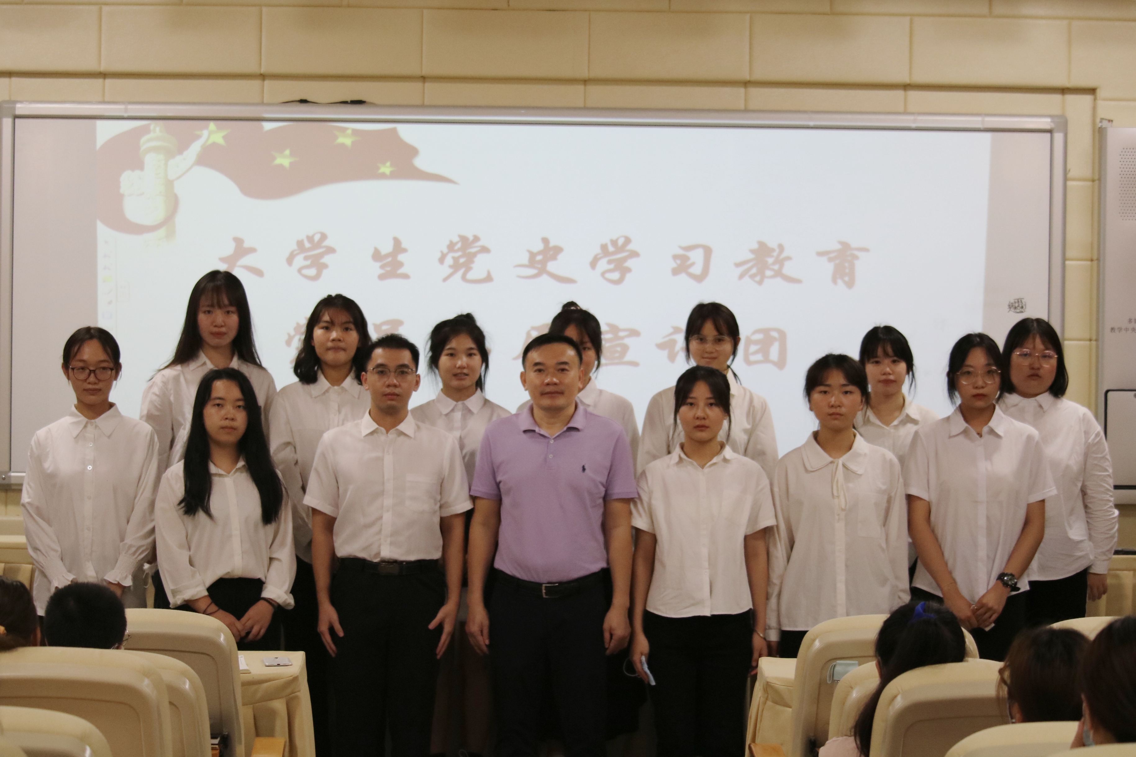 为喜迎党的二十大,更好地学习宣传习近平总书记系列重要讲话精神,用青春力量推动习近平总书记的系列重要讲话精神在大学生当中落地生根、开花结果,使党的理论在基层更有底气,英语系经过层层筛选,选拔出13名优秀学生党员,组建成立了大学生党史学习教育党员志愿宣讲团。