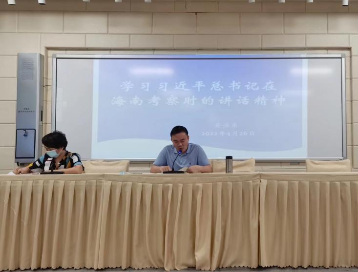4月26日,英语系党总支副书记吴清晖召开会议,传达学习习近平总书记在考察海南时的重要讲话精神。习近平总书记近日在海南考察时强调,要坚决贯彻党中央决策部署,坚持稳中求进工作总基调,完整、准确、全面贯彻新发展理念,全面深化改革开放,坚持创新驱动发展,统筹疫情防控和经济社会发展,统筹发展和安全,解放思想、开拓创新,团结奋斗、攻坚克难,加快建设具有世界影响力的中国特色自由贸易港,让海南成为新时代中国改革开放的示范,以实际行动迎接党的二十大胜利召开。