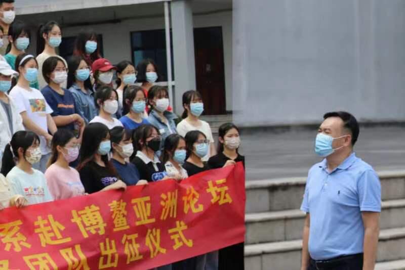 在出征仪式上,杨毅副院长对志愿者们表示鼓励与祝贺。他指出,当前疫情形势下,博鳌亚洲论坛年会如期召开十分不易,我们应珍惜国家给予的宝贵机会,向世界展现中国形象,展现海外院学子的风采。他强调,同学们要增强安全意识,以高度的责任心,脚踏实地地完成自身的服务工作,向全世界来宾展示中国热情好客、文明礼貌和开放自信的精神风貌。