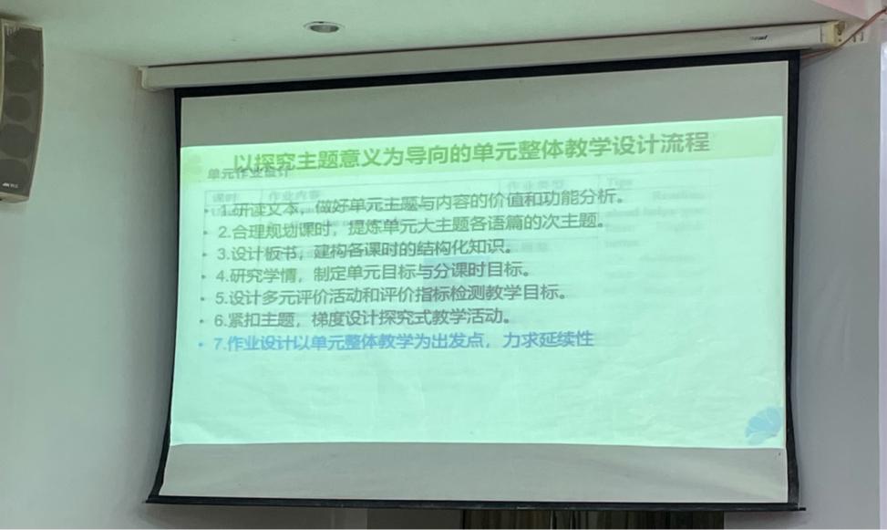 黄老师以五年级英语课标中的实例将在场师生引入本次讲座。由Module7中的“Animals”主题作为切入点,向同学们阐述了“主题”和“话题”的概念及其双方的重要意义。讲座内容同时涉及了单元整体教学设计流程所涉及的七步骤,黄老师结合课例,向在场同学进行了细致的解释。