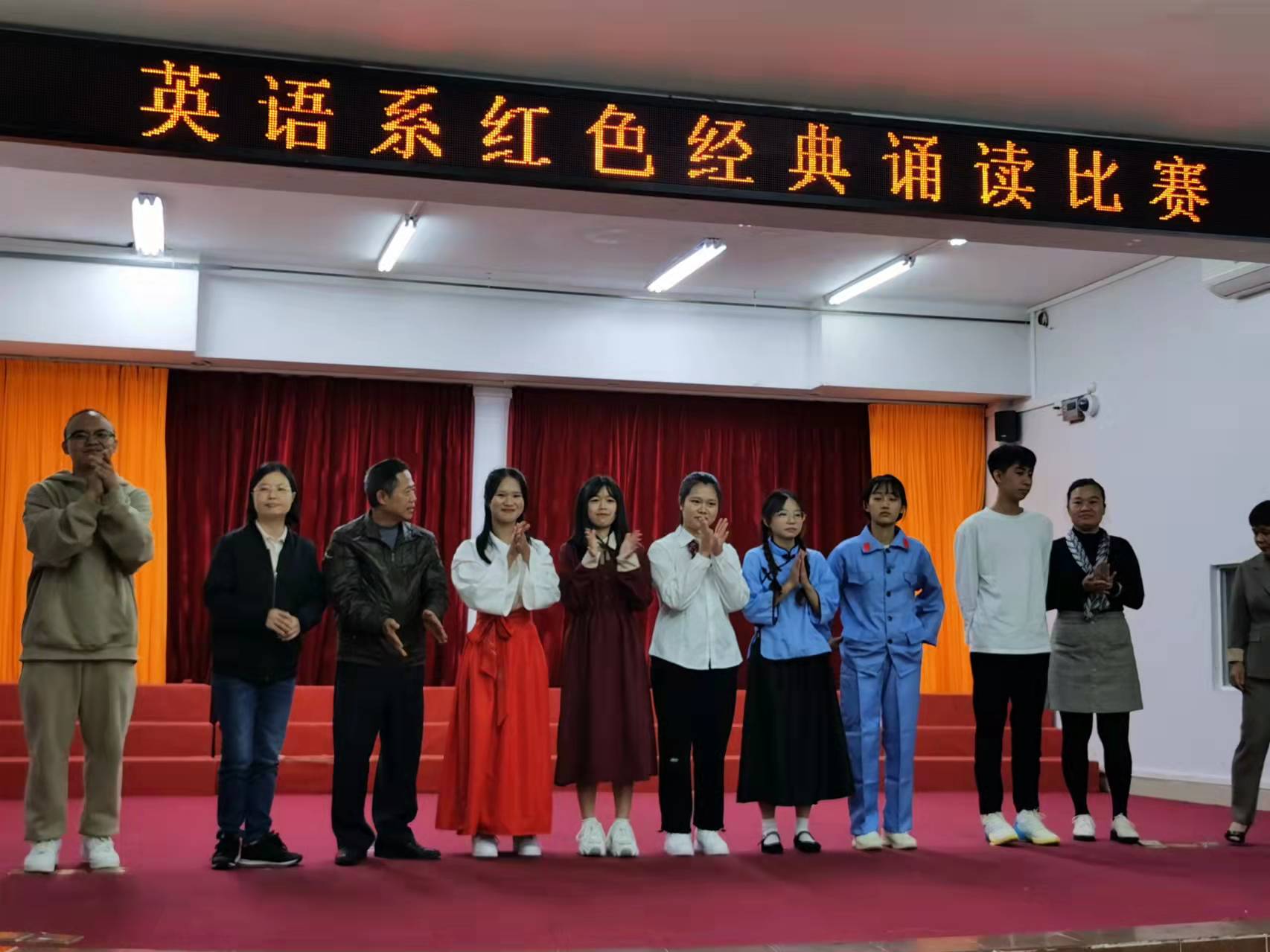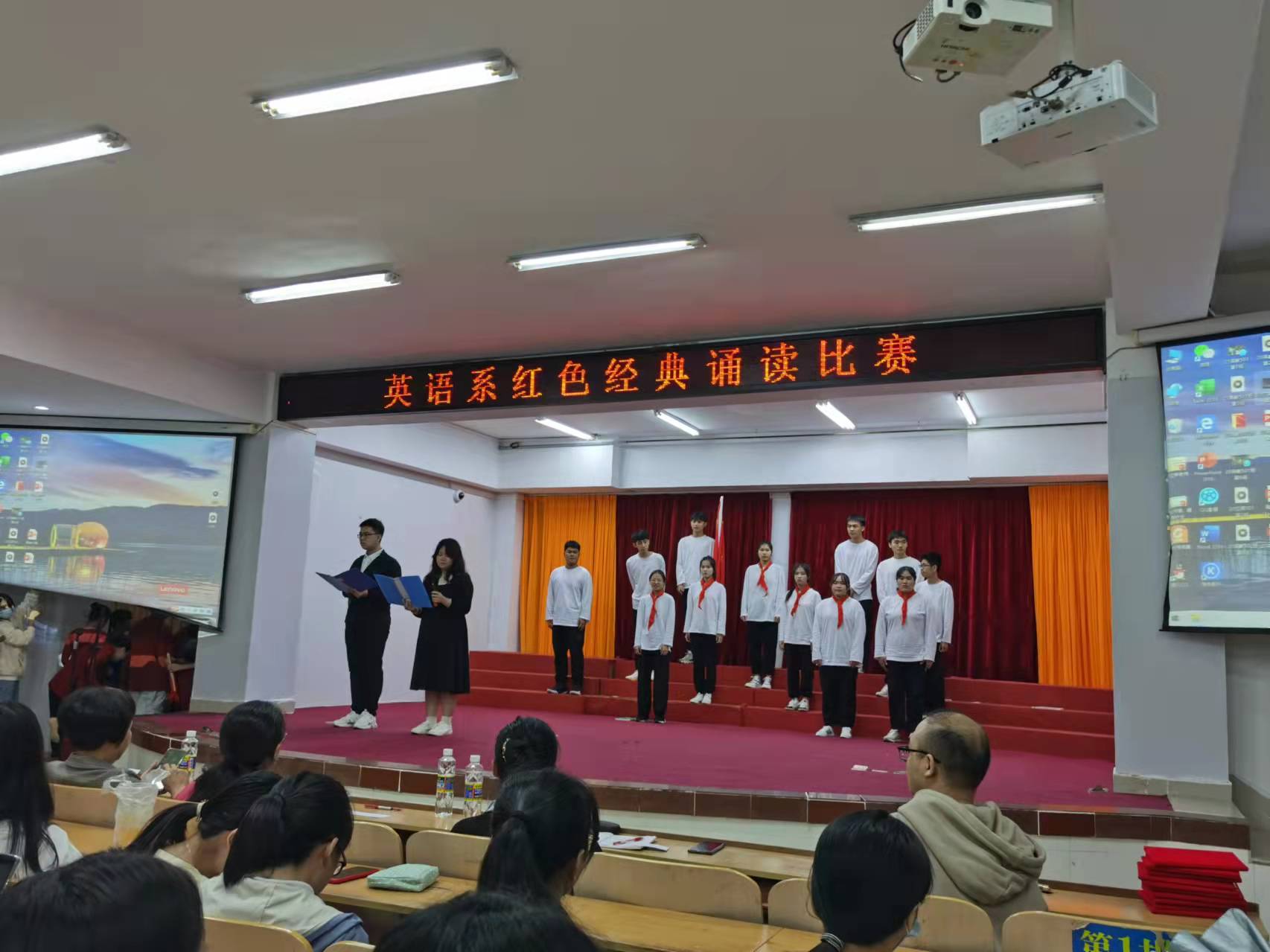 为培养学生的爱国热情,陶冶学生的艺术情操,增强集体凝聚力,激发我系青年学子的爱国热情,牢记当代大学生使命,弘扬时代精神,展现当代大学生风采,提升学生的诵读水平,展示青春活力,营造积极向上的校园文化氛围,英语系基础教研室11月20日晚上在多功能报告厅举行了五年一贯制2020级和2021级各班学生的红色经典诵读比赛。