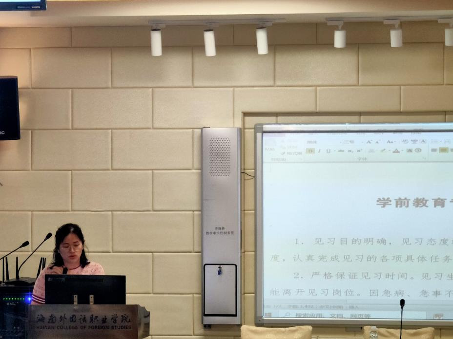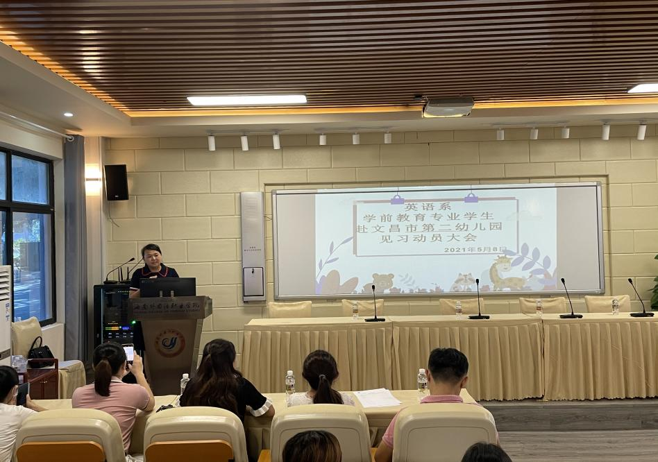 为确保见习工作顺利开展,我系于5月8日下午4点30分在综合楼AE101教室开展了见习动员大会。本次活动由学前教研室主任杨丹主持,同时也邀请到了文昌市第二幼儿园园长和负责此次活动的几位幼儿园指导老师参加。杨丹主任首先强调了此次见习活动的重要性,并就见习的内容任务、考核要求、见习报告撰写等做了具体部署。她还要求学生见习期间遵守纪律,提醒学生在要注意人身、交通、财产安全。