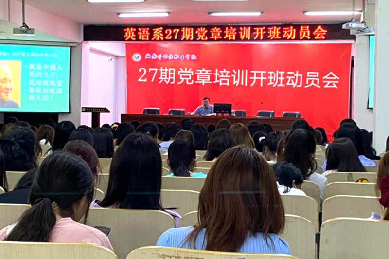 2021年3月14日,英语系党总支在多功能报告厅举行第27期党章培训开班仪式。本期培训班为期5天,共有186名学员参加,分别由英语系党总支副书记吴清晖、各支部书记和委员为申请入党学生们上课。