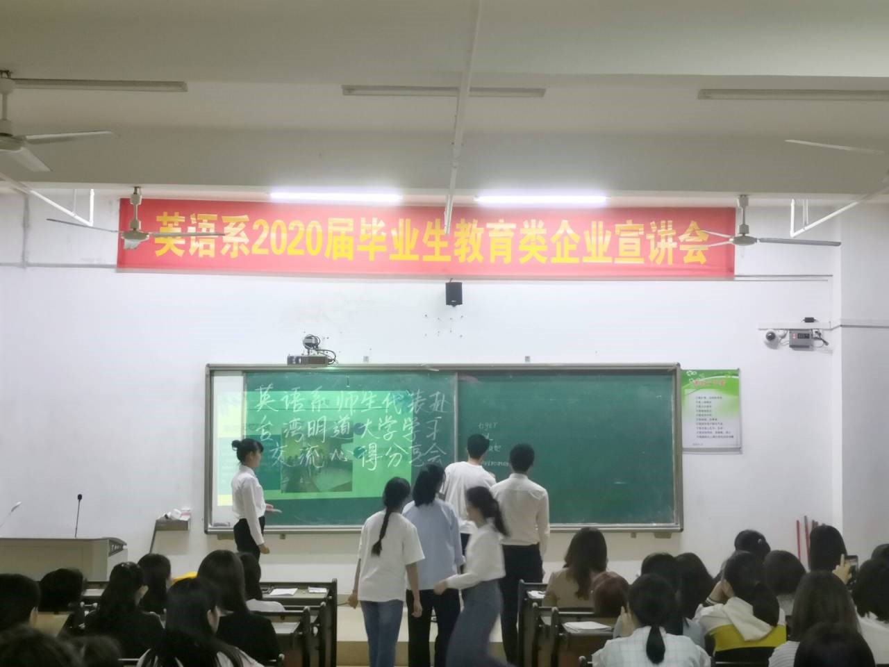 12月26日晚上,英语系师生代表团赴台湾明道大学交流分享会在综合楼AE102教室举行。会议由英语系副主任张清萍主持,全体非毕业班班长、副班长、学习委员及学生会干部共120多人参加本次交流会。
