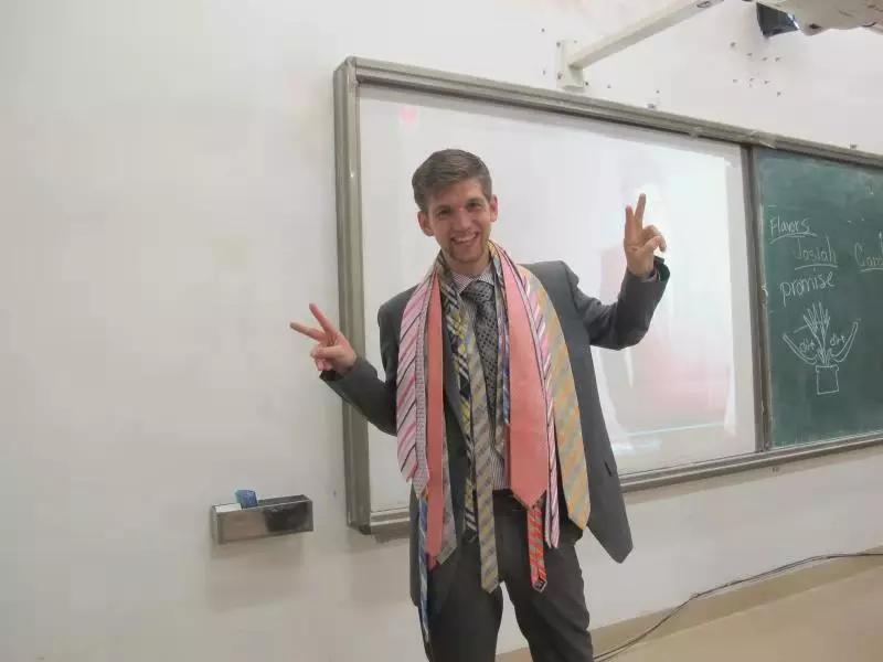 当然同学们不仅品尝了关于浪漫的蛋糕,还一起玩了关于浪漫的小游戏。例如男生扮演新郎进行系领带比赛和女生扮演新娘参加卷纸婚纱设计比赛。通过游戏同学们不仅了解到了美国婚礼文化,也现场操练了相关的词汇,句子和婚礼誓言等等,收获满满。