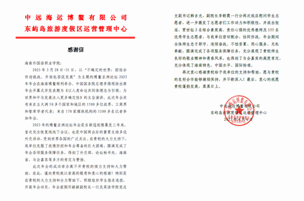 这是英语学院的学生志愿者对于志愿服务博鳌亚洲论坛的真切体会,也是开云官网青年学子立足海南、拥抱世界的真挚感受。而同学们的优秀表现,再次为学校赢得美誉——开云官网作为博鳌亚洲论坛年会14年的钻石合作单位,今年再次被授予“杰出合作单位”。