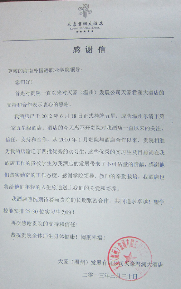 天豪君澜大酒店的感谢信